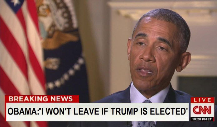 Երբ «Սի. Էն.Էն.»-ի հաղորդավարը հարցուց, թէ ան պիտի մնայ՞ ղեկին վրայ, Օպամայի պատասխանը եղաւ վճռական.«Ես նախագահի պաշտօնը պիտի չլքեմ, եթէ Թրամփ ընտրուի», կտրականապէս ըսաւ Օպամա: