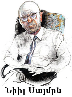 Սայմընի Թատրերգութեան բնոյթը.– Ընկերային լարուած յարաբերութիւնները իրենց ծանր շուքը ձգած են Սայմընի գործերուն վրայ: Ինչպէս` Էոնեսքօ, ինք եւս «կը խնդայ, որպէսզի չլայ» (1): Իր ստեղծած ծիծաղաշարժ կացութիւններուն մէջ միշտ ներկայ է ցաւը: Այս իմաստով իր գործը կարելի է համարել սեւ կատակերգութիւն: