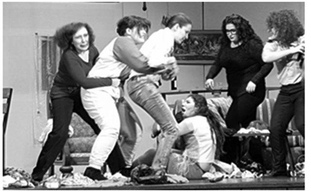 Բեմայարդարում եւ այլն.- Որմազդը աւելի տեղեկատուական եւ նկարագրական էր, քան` գեղարուեստական: Կրնար ըլլալ ժուժկալ եւ արտայայտիչ: Բեմադրիչը գործածած է շարժապատկերի երաժշտութիւնը(1): Բեմը դասաւորուած էր կատակերգութեան բազմաթիւ ելոյթներու դասաւորումի հետեւողութեամբ: Կ’օգտագործուէր հարթակի գրեթէ ամբողջ տարածքը: Բարի՛: Աւելի կարեւոր եւ աչքառու տեսարանները կը կատարուէին բեմին աջ կողմին վրայ: Բարի՛: Բացման տեսարանի թափթփածութիւնը ունէր ծաղրանկարային բնոյթ: Այդ թերեւս բանալի մըն էր հասկնալու բեմադրիչի մօտեցումը: Նկատելի է, որ թափթփածութիւնը աճած էր ելոյթէ ելոյթ: Հարկ էր, որ զգեստաւորումը ըլլար աւելի յարիր: Նրբաճաշակ, միջին տարիքի կին Ֆլորա, օրինակ, մուտք գործեց հագին պատառոտած ճինզ, որ վայել է պարմանուհիի մը: Պատառոտած ճինզով հանդէս եկաւ նաեւ անոր ընկերուհիներէն մին: Կիներու հագուկապը առհասարակ չէր արտայայտեր անոնց ընկերային դիրքը: Բեմադրիչ մը (Նաթան Մակի) վեց կիներուն տուած է Թրիվիալ Փըրսութ խաղի վեց գոյներով հաքուկապ` նշելու համար անոնց վեց տարբեր խառնուածքները: Կարելի էր այս ուղղութեամբ աւելի խորունկ մտածել: