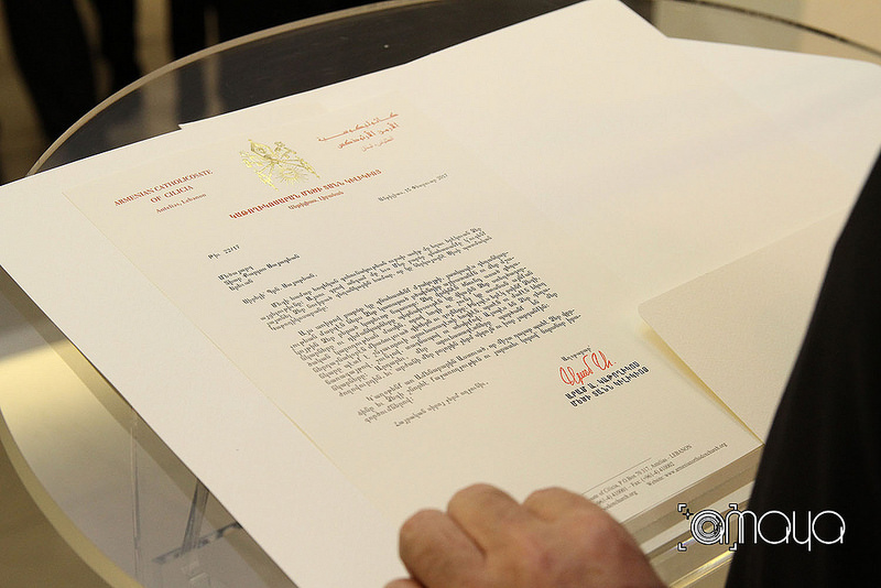 Մեզի համար ոգեկան գոհունակութեան ուրախ առիթ մը եղաւ երէկուան ձեր այցելութիւնը: Այսու գիրով անգամ մը եւս մեր բարձր գնահատանքը կ՛ուզենք յայտնել ձեր նուիրած գեղանկարին համար, որ կը ներկայացնէ Սիսի պատմական կաթողիկոսարանը: Այս առիթով բարձր կը գնահատենք մշակոյթի, յատկապէս գեղանկարչութեան մարզին մէջ ձեր կատարած բծախնդիր աշխատանքն ու մեր մշակոյթին ձեր բերած կարեւոր նպաստը: Ձեր վրձինէն ծնունդ առած գեղանկարները եւ դիմանկարները պերճախօսօրէն կը վկայեն ձեր ստեղծագործական կարողութեան մասին, որով հոգի ու շունչ կը ստանան այնքան ներդաշնակօրէն միաձուլուած գիծերն ու գոյները: Ինչպէս երէկ ըսինք ձեզի, նկարը պէտք է շնչաւորուի արուեստագէտի հոգիէն, սրտէն ու միտքէն եկող ճառագայթներով, շունչով, տագնապով ու տեսիլքով: Այսպէս են ձեր գեղանկարները: Արդարեւ, մեր արուեստագէտները պարծանք կը բերեն մեր ժողովուրդին եւ արժանի են բոլորին ջերմ սիրոյն ու յարգանքին: Կ՛աղօթենք առ ամենաբարին Աստուած, որ միշտ դալար պահէ ձեր վրձինը եւ ձեզի շնորհէ քաջառողջութիւն ու յարատեւ կորով` նորանոր իրագործումներով: