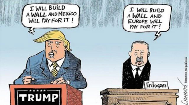 Ամէն պարագայի, բացայայտ թէ ծածուկ, ե՛ւ Թրամփ ե՛ւ Էրտողան կողմ են Իսրայէլի, եւ երկերես խաղ կը խաղան` ՏԱՀԵՇ-ի եւ Սուրիոյ պատերազմին առնչութեամբ: Միլիառատէր գործարարը նոյնպէս նման է Էրտողանի, ներգաղթեալներու տագնապին մէջ կրկնակի խաղերով եւ խուսանաւումներով: