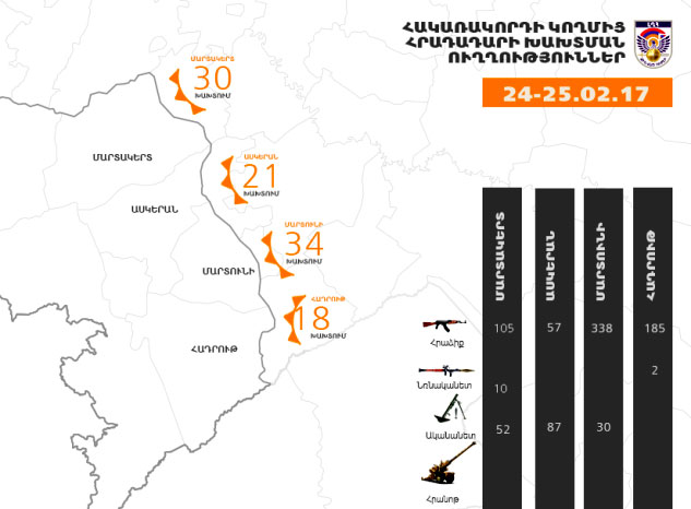 Բացի յարձակման փորձերէն 24-էն 25 փետրուարի լուսցող գիշերը արցախեան-ազրպէյճանական հակամարտ զօրքերու սահմանագիծի ամբողջ երկայնքով հակառակորդը, ականանետերէ, հրանօթներէ, նռնականետերէ ու տարբեր տրամաչափի հրաձգային զինատեսակներէ խախտած է զինադադարը` հայ դիրքապահներուն ուղղութեամբ արձակելով աւելի քան 860 կրակոց: Յատկապէս բուռն խախտումներ արձանագրուած են շփման գիծի արեւելեան եւ հիւսիսային ուղղութիւններով: Նշուած հատուածներուն մէջ հակառակորդը 60, 82 եւ 120 միլլիմեթրնոց ականանետերու եւ Դ-44 տիպի հրանօթներու կիրարկումով ընդհանուր առմամբ արձակած է 169 արկ: