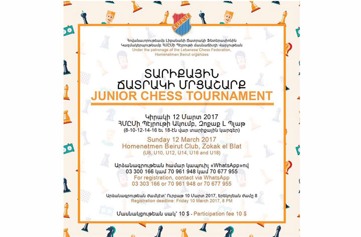 Հովանաւորութեամբ Լիբանանի ճատրակի ֆեատերասիոնին եւ կազմակերպութեամբ ՀՄԸՄ Պէյրութի մասնաճիւղի վարչութեան, կիրակի, 12 մարտին, ՀՄԸՄ Պէյրութի ակումբին մէջ (Զոքաք Պլաթ) տեղի պիտի ունենայ ճատրակի տարիքային մրցաշարք մը` 8, 10, 12, 14, 16 եւ 18 տարեկանէն վար դասակարգերուն մէջ: