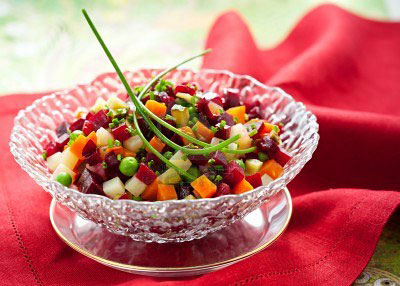 Ներկայանալի փոս ամանի մը մէջ լեցնել մանր եւ խորանարդաձեւ կտրտուած բանջարեղէնները, ինչպէս նաեւ` խնձորը: