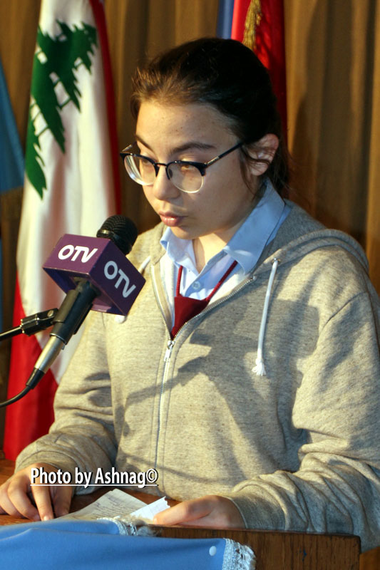 Լիբանանի, Հայաստանի եւ ԼՕԽ-ի քայլերգներու յոտնկայս ունկնդրութենէն ետք, Ազգային Լեւոն եւ Սոֆիա Յակոբեան վարժարանէն աշակերտներ Քրիստել Արթինեան` հայերէն եւ Գարոլին Տէր Կարապետեան` արաբերէն լեզուներով արտասանեցին բացման խօսքը, բարի գալուստ մաղթեցին աշակերտներուն եւ պաշտօնական հիւրերուն: