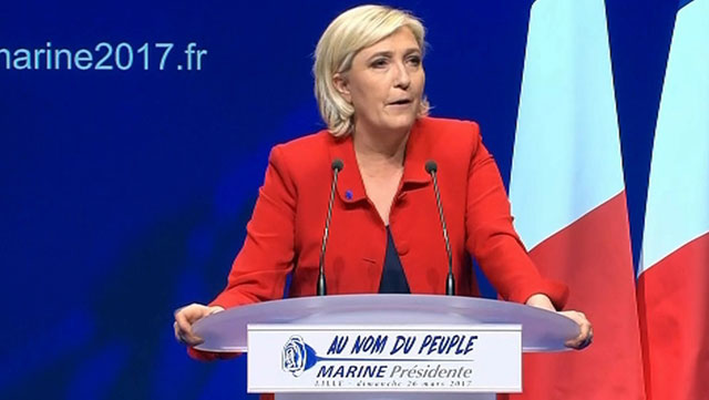 «Եկած է համաշխարհայնացումին աջակցողները ջախջախելու ժամանակը», ըսած է ան իր հիմնական մրցակիցներ Էմանուէլ Մաքրոնի եւ Ֆրանսուա Ֆիյոնի հասցէին` զանոնք մեղադրելով «դաւաճանութեան» ամբաստանութեամբ` յանուն Եւրոպական Միութեան եւ շուկայի շահերուն: