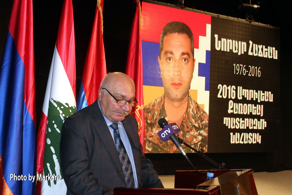 Խօսք առաւ Լիբանանի մէջ Հայաստանի Հանրապետութեան արտակարգ եւ լիազօր դեսպան Սամուէլ Մկրտչեան: Ան անդրադառնալով տարի մը առաջ տեղի ունեցած ապրիլեան իրադարձութիւններուն, որոնք խոր հետք ձգած են մեր հաւաքական յիշողութեան վրայ եւ բազմաթիւ մտորումներու առիթ հանդիսացած, ըսաւ, որ պէտք է անընդհատ խօսուի եւ յիշուի, որ մենք ականատես եղանք մեր ժողովուրդի հերոսացման հերթական դրուագի մը, երբ խրամատներուն մէջ երիտասարդները իրենց կեանքը զոհեցին` ապացուցելով, որ հայրենիքի զինուորէն աւելի բարձր կոչում չկայ եւ միայն այն զոհողութեան միջոցով կարելի է պահել հողը եւ ապահովել ժողովուրդներու, երկու պետականութիւններու անվտանգութիւնն ու խաղաղ զարգացումը: Դեսպանը հաստատեց, որ իրադարձութիւնները վառ կերպով ցոյց տուած են աշխարհի տարածքին համահայկական համազգային համերաշխութիւնը, կրկին անգամ աշխարհի բոլոր անկիւններուն եւ յատկապէս Լիբանանի մէջ հայութեան տարբեր հատուածները բողոքի իրենց ձայնը բարձրացուցած են հակառակորդի նենգ գործողութիւններուն դէմ, աշխարհի ուշադրութիւնը գրաւած են հայ ժողովուրդի արդարացի այդ կռիւի դրուագին եւ նեցուկ կանգնած իրենց կեանքը զոհելու պատրաստ զինուորներուն:
