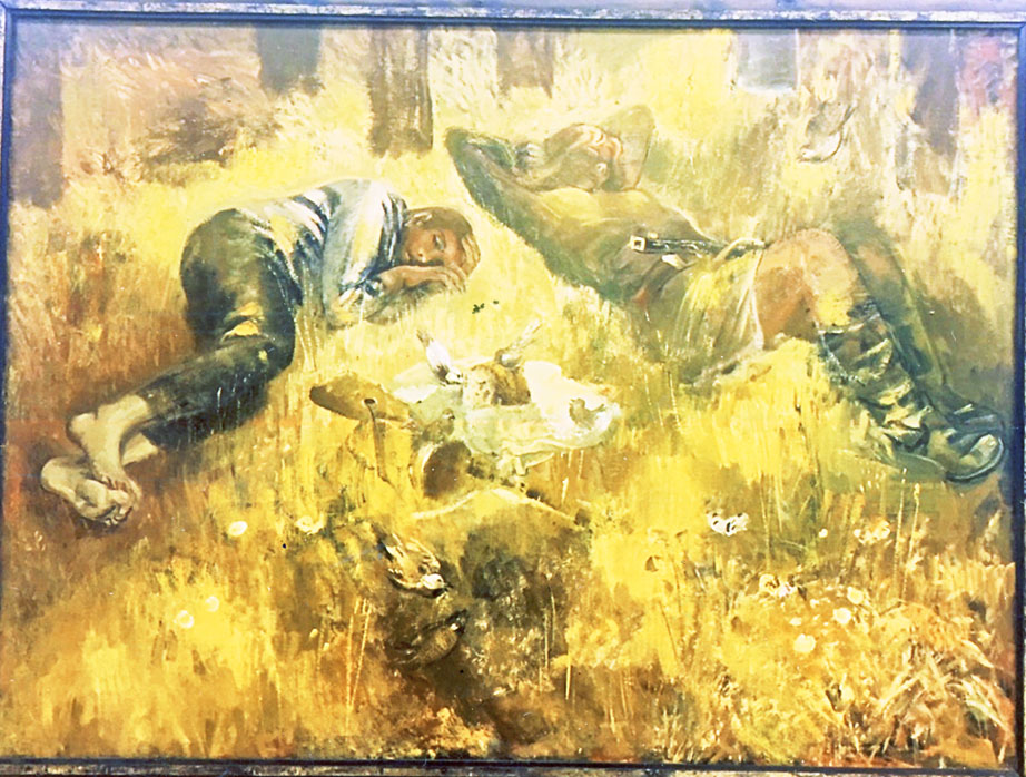 Բաղրամեանի հայրենասիրութիւնն ու մարդասիրութիւնը չենք կրնար նժարի վրայ դնել: Ան մասնակցած է Սարդարապատի պատերազմին եւ երկու տարի ծառայած է նաեւ իբրեւ հայ զինուոր` գործնապէս ապացուցելով ազգին համար զոհուելու իր պատրաստակամութիւնը: Սարեան կրցած է կերտել բարի, անձնուէր, մարդասէր ու վճռակամութեամբ լի հերոսական հայ զինուորի կերպարը: Ուշադրութեան արժանի յաջորդ գեղանկարներէն մէկը անկասկած որ Էդիկ Բերդեանի «Երգ` երիտասարդ ֆետայիներու մասին» կտաւն է: Այս ստեղծագործութիւնը ունի ոչ սովորական լուծում: Պարզ գիւղական հագուստներով եւ Բ. Համաշխարհային պատերազմին բնորոշ զէնքերով երկու ֆետայիներ (փարթիզաններ), իրենց զինուորական առաքելութիւնը յաջողութեամբ իրագործելէ եւ նախաճաշելէ ետք, հանգիստ խղճով ու գոհունակ տրամադրութեամբ կը մրափեն պուրակի մը մէջ, ուր առաւօտեան թարմ շողերու տակ անմեղ ու քնքուշ թռչնակներ եկած են կտցահարելու եւ աւարտելու հաց-պանիրի անոնց համեստ պաշարը: Արուեստագէտը բնութեան անդորրութիւնը, թռչնակներու անմեղութիւնն ու կեանքի հմայքը կը հակադրէ ընչաքաղցութենէ ծնունդ առած կեանքի դաժանութեան ու անիմաստ աւերներուն: Խորապէս մարդկային կեցուածք մը, զոր գեղեցկօրէն դրսեւորած է, մեր պատմութեան կարգ մը դրուագներու եւ յատկապէս «Սասնայ Ծռեր» դիւցազանավէպի մէջ: