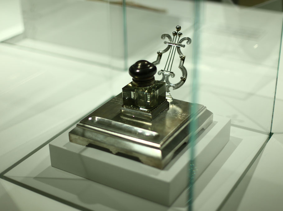 Բիւրեղապակեայ թանաքամանով արծաթեայ գրչակալը Կոմիտասին նուիրած են իրմով հիացողները` 1908-ին Պաքուի համերգներէն մէկու ընթացքին: Գրչամանին վրայ գրուած է. «Հայ Ժողովրդական երգերուն հոգի տուող խոհուն երաժշտագէտ հայր Կոմիտասի վարդապետին` անոր գեղարուեստական տաղանդը գնահատողներուն կողմէ»: