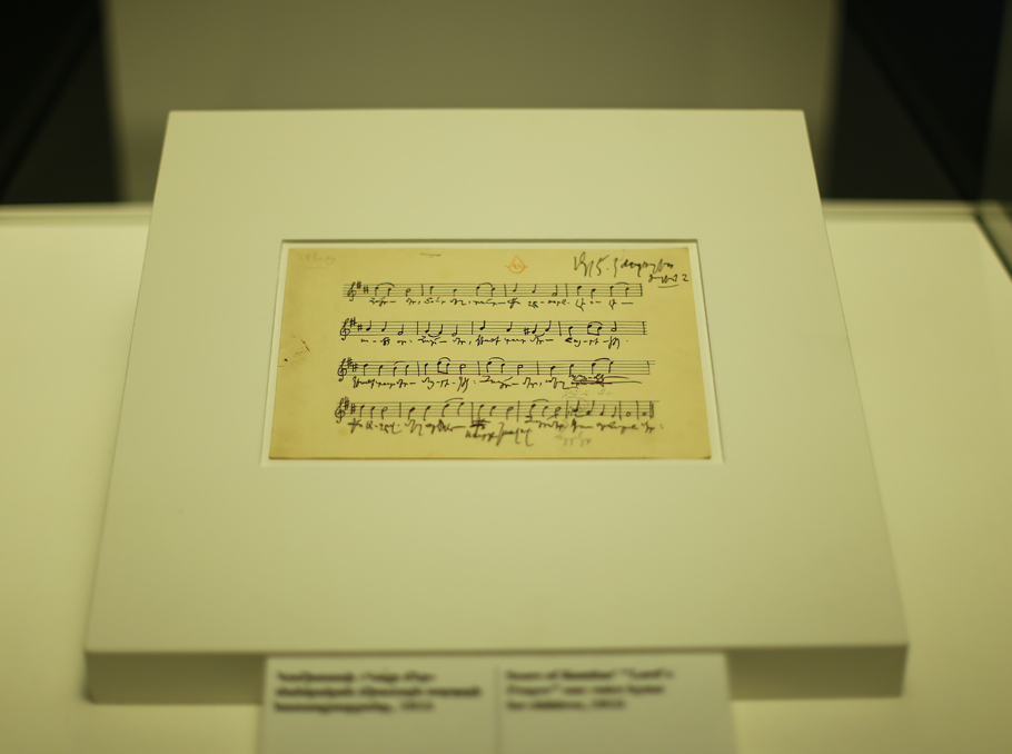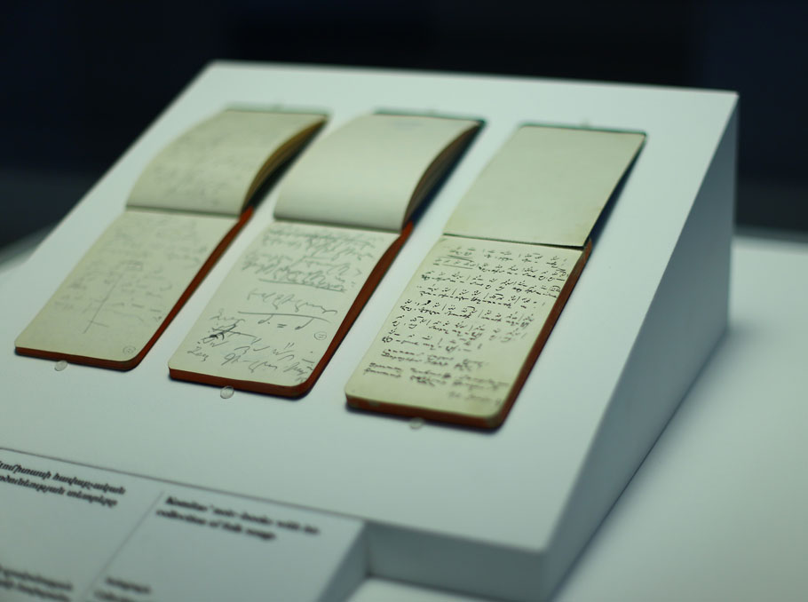 Թանգարանին մէջ ցուցադրուած են նաեւ մեծ երաժիշտին բանահաւաքական տետրերը: Անոնց վրայ առաջին ակնարկ մը` եւ կարծէք օտար լեզուով գրուած տառեր ըլլան: Իրականութեան մէջ անոնք հայկական նոր նոթագրութիւն են` Լիմոնճեան Համբարձումի ստեղծագործութիւնը (1813), որ ըստ Կոմիտասին, աւելի գործնական է եւ դիւրին կիրարկելի: