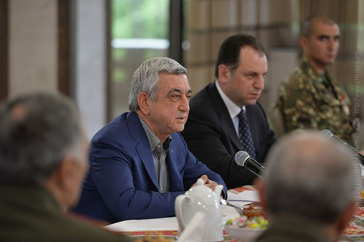 Հայաստանի Հանրապետութեան նախագահի պաշտօնական կայքը կը հաղորդէ, թէ աշխատանքային այցելութեամբ Արցախի Հանրապետութիւն գտնուող Հայաստանի նախագահ, զինուած ուժերու գերագոյն գլխաւոր հրամանատար Սերժ Սարգսեան երէկ Շուշիի մէջ հանդիպում ունեցած է 2017-ին զօրացրուած, ինչպէս նաեւ ներկայիս ժամկէտային զինուորական ծառայութեան մէջ գտնուող եւ ծառայութեան ընթացքին անձնուիրութեան ու խիզախութեան համար խրախուսման արժանացած խումբ մը զինուորներու եւ զօրացրուած սպաներու հետ: Հանդիպումին մասնակցած են Հայաստանի Հանրապետութեան պաշտպանութեան նախարար Վիգէն Սարգսեան, ինչպէս նաեւ զինուորականներ` հազարապետ – զօրավար Նորատ Տէր Գրիգորեանց եւ գնդապետ – զօրավար Արկադի Տէր Թադեւոսեան, որոնց անցած ուղին օրինակ է ներկայիս զինուորներուն համար:
