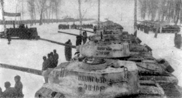 Ամերիկայի հայերը, որոնք տարաբնոյթ օգնութիւն կը ցուցաբերէին պատերազմի պատճառով ուժասպառ եղած Խորհրդային Միութեան եւ յատկապէս հեռաւոր Մայր Հայաստանին, նոյնպէս մեծ ներդրում ունին «Սասունցի Դաւիթ» հրասայլային շարասիւնի ստեղծման գործին մէջ: «Սասունցի Դաւիթ»-ը մասնակցած է խորհրդային տարածքներու ազատագրման համար Կարմիր բանակի յաղթարշաւին: Իսկ «Զօրավար Բաղրամեան» հրասայլային շարասիւնի կազմութիւնը, որ սկսած է 1945 թուականին, կանգ առած է Համաշխարհային Բ. պատերազմի աւարտէն ետք:
