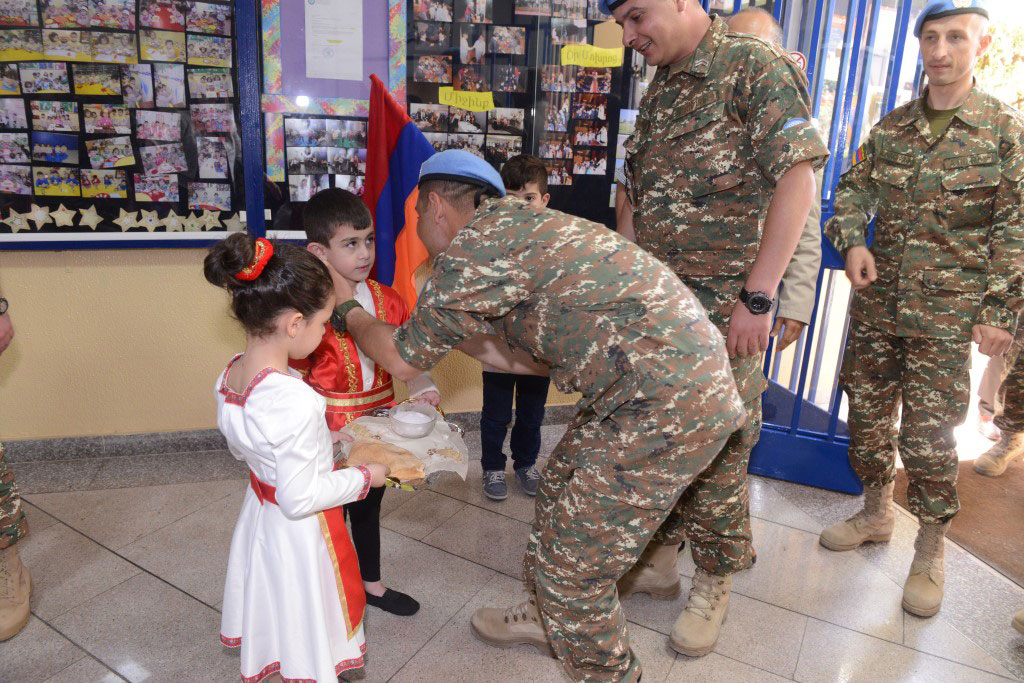 Վարժարանի դրան մուտքին Ծաղիկ դասարանի աշակերտներուն կողմէ աղ ու հացով դիմաւորուելէ ետք, զինուորները` «Մեր անունն է հայկական բանակ» երգի կշռոյթին տակ մուտք գործեցին բակ, ուր դպրոցի ամբողջ աշակերտութիւնը խմբուած էր Ծիծեռնակաբերդի մանրակերտ յուշարձանին շուրջ: