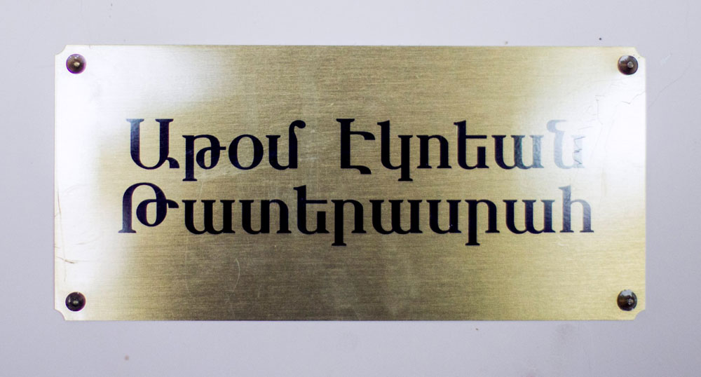 Շուշի քաղաքի Մկրտիչ Խանամիրեանի անուան պետական թատրոնի սրահներէն մէկը անուանակոչուած է քանատահայ յայտնի բեմադրիչ Ատոմ Էկոյեանի անունով: Այս մասին գրած է Ատոմ Էկոյեանի կողակիցը` Արսինէ Խանճեան, «Ֆէյսպուք»-ի իր էջին վրայ: