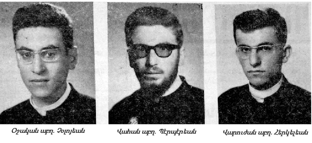 Երեք աբեղաները, Անթիլիասի դպրեվանքի Ժառանգաւորաց բաժնի ուսմանց քառամեայ շրջանը աւարտելէ ետք, կուսակրօն սարկաւագ ձեռնադրուած են 1964-ին: Ընծայարանի ուսմանց եռամեայ շրջանը կ՛աւարտեն այս տարի: