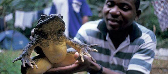 … Ունի նապաստակի մը չափը: Հոլիաթ գորտը կ՛ապրի Քամերունի եւ Հասարակածային Կինիայի շրջաններուն մէջ: Սակայն այս իսկական հրէշը կորսուելու վտանգի տակ կը գտնուի: Ան կրնայ մինչեւ 33 սմ մեծութիւն ունենալ եւ կշռել մինչեւ 3,2 քիլօ, այսինքն` մօտաւորապէս ընտանի կատուի մը չափ: Մէկ ոստումով ան կրնայ ցատկել մինչեւ 3 մեթր: