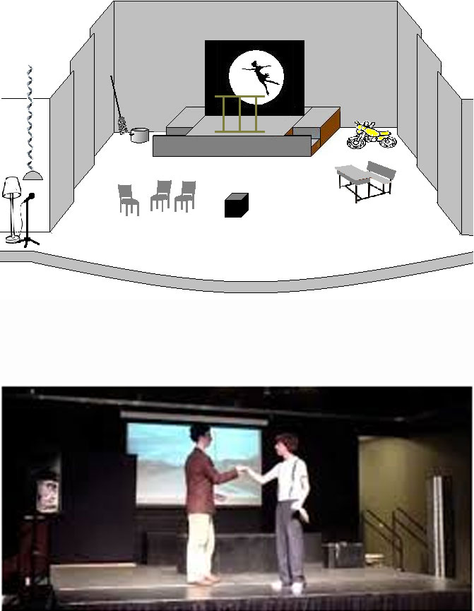 Բեմայարդարում եւ այլն.- Երկու «գիտաշխատողները» հիմնականին մէջ կը պատրաստեն ամպիոն մը եւ պաստառ մը: Այսինքն բեմ` բեմի վրայ: Նման լուծում ունէր նաեւ «Գասպար Իփէկեան» թատերախումբին նախորդ ելոյթը: Ստուերներու պաստառը ճկուն միջոց մըն է, որ կարելի է մեկնաբանել բազմաթիւ ձեւերով: Շա՛տ բարի: Պաստառի կլոր եւ նախնական ըլլալը խոտոր կը համեմատի ապագայապաշտ (futuristic) ճարտարագիտութեան հետ, բայց` ինչեւիցէ: Շարժական վանդակաճաղը էական էր Ռոմէօ-Ժիւլիեթ պատշգամի… ներողութիւն, Լեոն-Սոֆիա պատշգամի (կրճատուած) տեսարաններուն համար: Խոտոր էր նաեւ սեւ «օճառի սնտուկը» (1): Լեոն ունէր բարձրախօս, իսկ գիւղացիք ատենախօսներ չէին: Բեմայարդարումը առհասարակ նուազապաշտական էր (մինիմալիստ): Բարի՛: Ինչպէս «Գասպար Իփէկեան»-ի նախորդ երեք ելոյթներուն մէջ, նոյնպէս եւ այստեղ, բեմի ձախ կողմին վրայ կար բարձրախօս: Ասիկա կը թուի օրինաչափ դարձած ըլլալ: Կարելի է նշել, որ այս «Յիմարներու» առաջին մինիմալիստ մերօրեայ եւ պաստառաւոր բեմայարդարումը չէ: Կողքի նկարին մէջ` նկատել մէկ ու միակ նստարան-ամպիոնը եւ պաստառը, որ ցոյց կու տայ Ամերիկայի կորած անկիւններէն մէկը (2): Այսուհանդերձ, բարի՛: