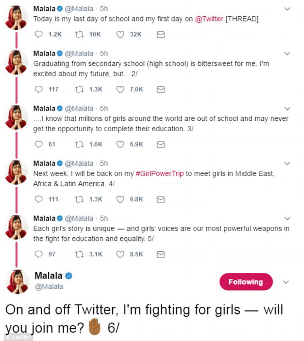 20-ամեայ իրաւապաշտպանը այս մասին յայտնած է թուիթըրեան իր առաջին արձանագրութեամբ: «Այսօր իմ վերջին օրս է դպրոցին եւ առաջին օրը «Թուիթըր»-ի մէջ», գրած է փաքիստանուհին: