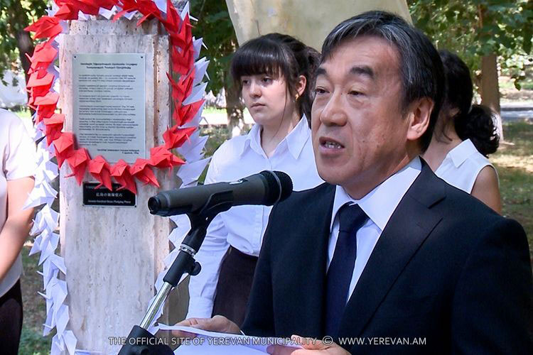 Երեւանի քաղաքապետարանի աշխատակազմի մշակոյթի վարչութեան պետ Ռուբէն Յովհաննիսեան եւ Հայաստանի մէջ Ճափոնի արտակարգ եւ լիազօր դեսպան Էյճի Թակուչի ներկայ գտնուած են մայրաքաղաքի մանկական զբօսայգիին մէջ տեղադրուած Խաղաղութեան ուխտի յուշաքարին մօտ Հիրոշիմայի եւ Նակազաքիի հիւլէական ռմբակոծումի զոհերուն յիշատակին նուիրուած արարողութեան: