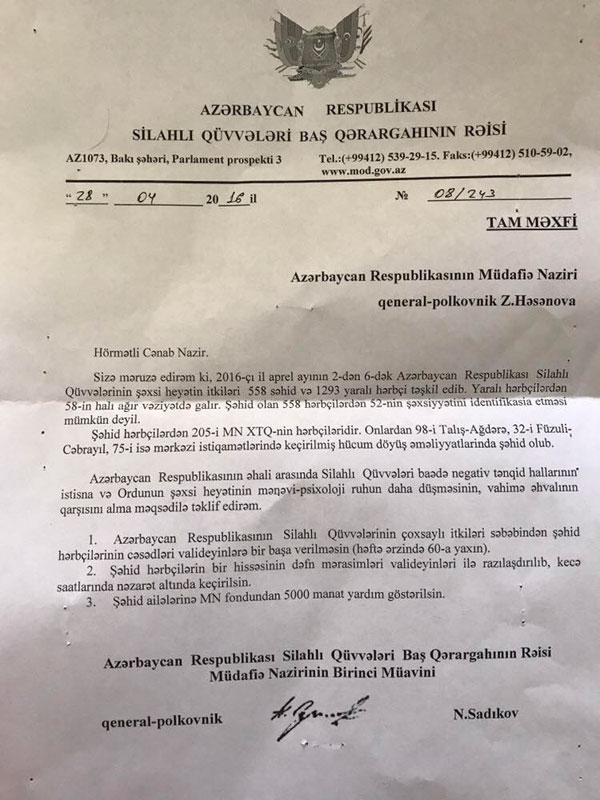 Զեկուցում եմ Ձեզ, որ 2016թ.-ի ապրիլի 2-ից 6-ն ընկած ժամանակահատուածում Ազրպէյճանի Հանրապետութեան զինուած ուժերի անձնակազմի ընդհանուր կորուստները կազմել է 558 զոհուած եւ 1293 վիրաւոր զինծառայող: Վիրաւոր զինծառայողներից 58-ը գտնւում են ծայրայեղ ծանր վիճակում: Զոհուած 558 զինծառայողներից 52-ի անձը հնարաւոր չէ նոյնականացնել: