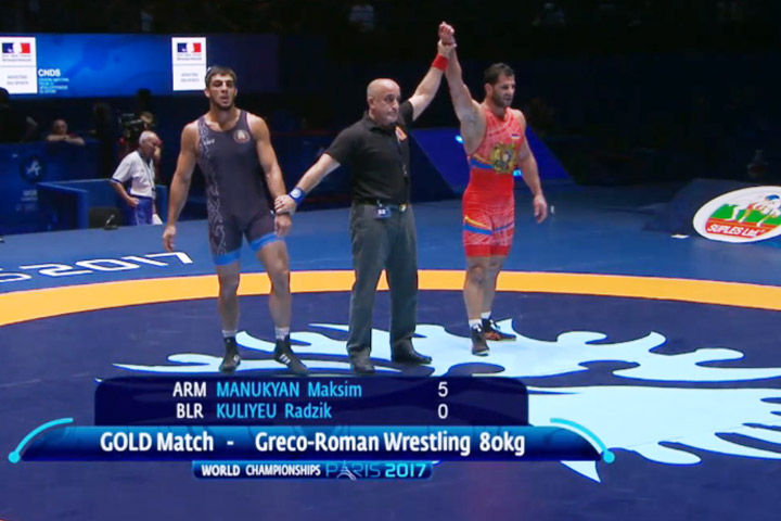 Յունահռոմէական ոճի ըմբշամարտի աշխարհի ախոյեանութեան 80 քկ կշիռքի աւարտական մրցումին Մաքսիմ Մանուկեան մրցեցաւ այս տարուան Եւրոպայի փոխախոյեան, Պիելոռուսիան ներկայացնող Ռատիկ Քուլիեւի հետ: