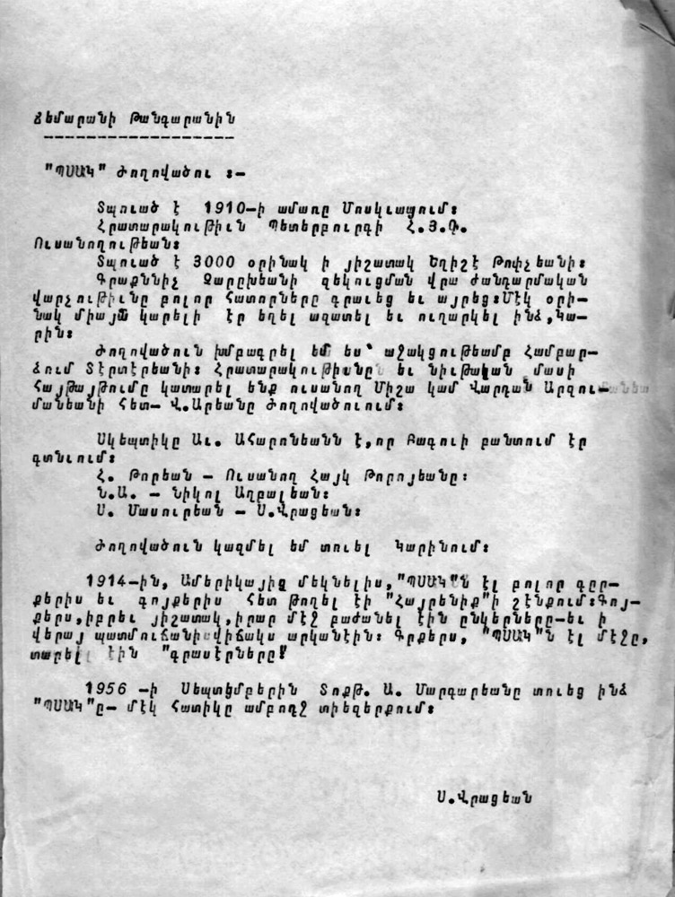 «Պսակ»-ի միակ օրինակը կ’ապրի ոդիսական մը եւս: «Կեանքի ուղիներով»-ը չի յիշատակեր այս պարագան: Ս. Վրացեան «Ճեմարանի թանգարանին» խորագրեալ մեքենագրուած էջի մը վրայ տեղեկութիւններ կու տայ «Պսակ» ժողովածուին մասին(8): Այս էջը կցուած է ժողովածուի վերջընթեր կողքին: Ան կը յայտնէ, որ 1914-ին, երբ պիտի վերադառնար Միացեալ Նահանգներէն, իր բոլոր գիրքերը (ներառեալ` «Պսակ»-ը) եւ գոյքերը կը թողու «Հայրենիք»-ի շէնքին մէջ: Գոյքերը, իբրեւ յիշատակ, Ամերիկայի ընկերները իրարու մէջ բաժնած են «եւ ի վերայ պատմուճանի վիճակս արկանէին»(9) կը գրէ Վրացեան իրեն յատուկ սրամտութեամբ: «Պսակ»-ն ալ, այլ գիրքերու հետ, տարած էին «գրասէրները»: «1956 սեպտեմբերին, տոքթ. Ա. Մարգարեան տուեց ինձ «Պսակ»-ը մէկ հատիկը` ամբողջ տիեզերքում»(9):