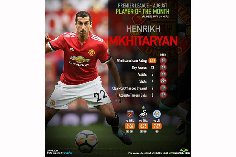 WhoScored.com կայքը «Փրեմիեր լիկ»-ի օգոստոս ամսուան լաւագոյն ֆութպոլիստը ճանչցաւ Մանչեսթըր Եունայթըտի եւ Հայաստանի ֆութպոլի ազգային հաւաքականի միջնապահ Հենրիխ Մխիթարեանը: