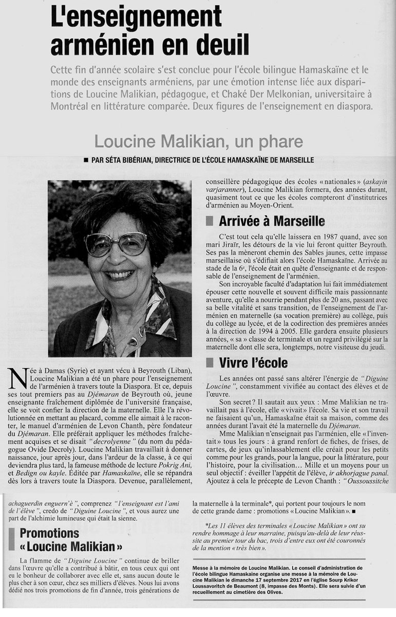 Ստորեւ Ֆրանսայի մեր գաղափարակից օրկան «Ֆրանս Արմենի» ամսաթերթէն թարգմանաբար կը ներկայացնենք աւելի ծաւալուն, լրացուցիչ անդրադարձ մը` Լուսին Մալիքեանի բազմամեայ գործընկեր եւ Համազգայինի Մարսէյի Ճեմարանի ներկայ տնօրէնուհի Սեդա Պիպերեանի գրիչէն: