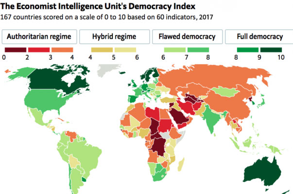 «Ժողովրդավարական ինտեքս-2017» զեկուցումը պատրաստուած է բրիտանական «Էքոնոմիսթ» հեղինակաւոր թերթի հետազօտական ընկերութեան կողմէ, որ երկիրները գնահատած է 0-էն 10 պալի համակարգով: