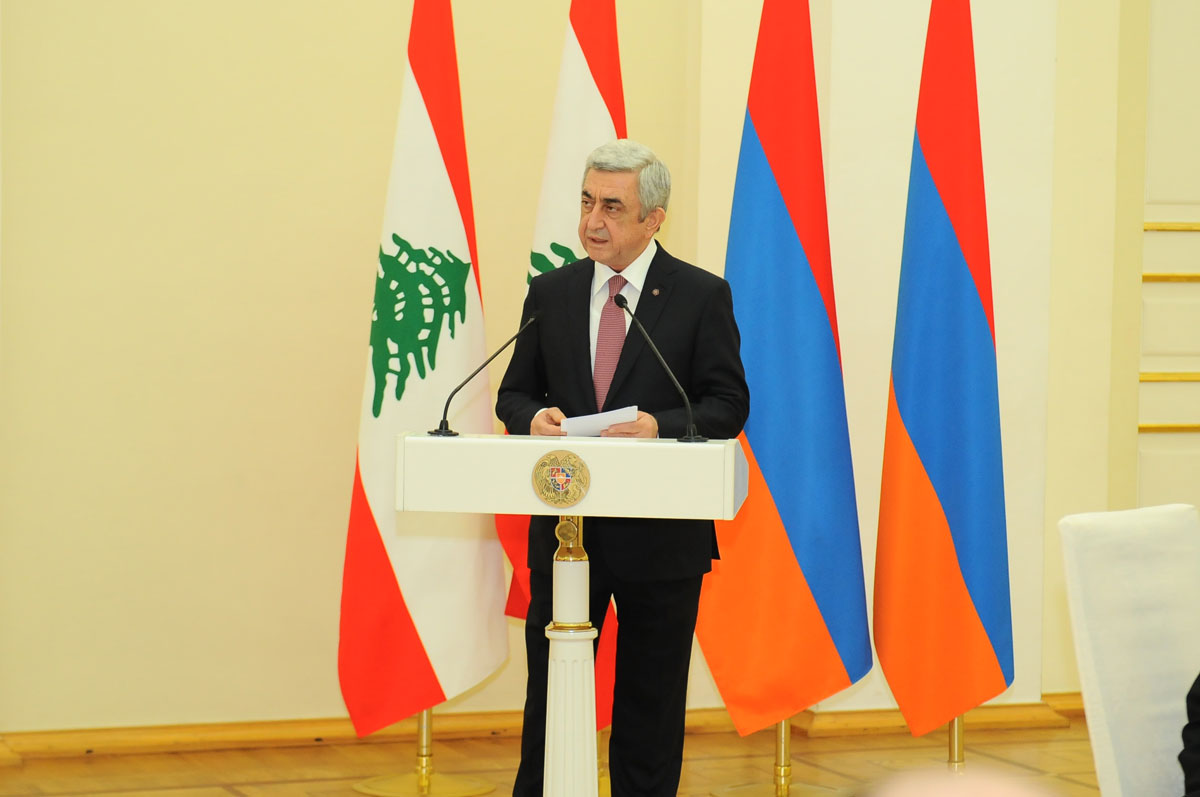 Մէկ անգամ եւս ջերմօրէն ողջունում եմ Լիբանանի Հանրապետութեան նախագահ, զօրավար Միշել Աունին եւ նրան ուղեկցող պատուիրակութեան անդամներին Հայաստանում: Պարո՛ն նախագահ, սա ձեր անդրանիկ այցն է մեր երկիր, որը, վստահաբար, նոր լիցք կը հաղորդի ամուր պատմական կապերի վրայ խարսխուած մեր բարեկամական յարաբերութիւններին: