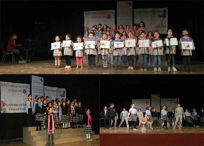 Յաջորդաբար բեմ բարձրացան 2-րդ դասարանի աշակերտները` երգով, դպրոցին պարախումբը ներկայացուց ռուսական եւ իտալական պարեր, 4-րդ կարգի աշակերտները հանդէս եկան «Ուսուցիչներուն» խմբային արտասանութեամբ, իսկ 3-րդ դասարանի աշակերտները` «Thank You Teachers» խմբային երգով: Ապա առաջին դասարանցիները ներկայացուցին «Ով ուսուցիչ» երգը, որուն յաջորդեց 7-րդ դասարանցիներ Աքասիա Ազատեանին եւ Ճիւլի Այվազեանին ասմունքը` «Teachers For All Seasons», այնուհետեւ 6-րդ կարգի աշակերտները ներկայացուցին «Եօթը ազնիւ պատգամ» բանաստեղծութիւնը: 4-րդ դասարանցի Քարլա Ռուպէլեանը ասմունքեց «Դաստիարակին» քերթուածը: 11-րդ դասարանէն խումբ մը աշակերտներ իրենց յատուկ ձեւով շնորհակալութիւն եւ երախտագիտութիւն յայտնեցին իրենց ուսուցիչներուն` մէկ առ մէկ նշելով անոնց անունները եւ յատկութիւնները: Իսկ աւարտական բաժնի աշակերտները «Դպրոցի ճամբան» երգով իրենց վերջին յիշատակները կազմեցին, նախքան դպրոցին հրաժեշտ տալը քանի մը ամիս ետք: