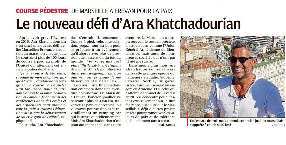 «Սփորթց. նիուզ. ամ» հայկական լրատուական կայքը կը հաղորդէ, որ ֆրանսահայ մարզիկ Արա Խաչատուրեան 103 օրուան իր վազքով ֆրանսական Մարսէյ քաղաքը եւ Երեւանը իրարու պիտի միացնէ: