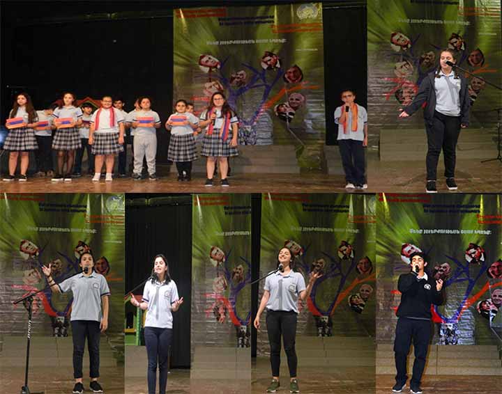 Գեղարուեստական բաժնով յաջորդաբար ելոյթ ունեցան մանկապարտէզի Ծաղիկ եւ Կոկոն դասարաններու աշակերտները` ասմունքով ու երգով, 7-րդ դասարանէն Աքասիա Ազատեան` «Յիշեցէք զիս» ոտանաւորով, 2-րդ դասարանէն Կալի Քըվըրեան եւ Կապրիէլլա Գոգեան` ապրիլեան խոհերով, 7-րդ դասարանէն Սելին Գոգեան` «Հայաստան» բանաստեղծութեամբ, ապա 5-րդ դասարանի աշակերտները` «Հնչեն զանգեր», «Ես կամ» եւ «Հայե՛ր, միացէ՛ք» երգերով: 3-րդ դասարանի աշակերտները ասմունքեցին «Երգ հայրենիքի մասին», Աքասիա Ազատեան դաշնամուրի վրայ նուագեց «Մեղեդի» նուագը, որուն յաջորդեց 4-րդ դասարանին կատարողութեամբ «Մեզ հետ է եւ Ինքը` Աստուած» ասմունքը, ապա բեմ բարձրացաւ 10-րդ դասարանցի Սթեֆանի Փափազեանը` «Պիտի իյնաս» բանաստեղծութեամբ: Նաեւ 10-րդ դասարանէն Մարկրիթա Մալտոսեան ասմունքեց «Հաւատում եմ քեզ» ոտանաւորը, ապա յայտագրի վերջին բաժնով ելոյթ ունեցաւ BT3 դասարանի աշակերտ Սերժիօ Ահարոնեանը` «Տուն իմ հայրենի» երգով: