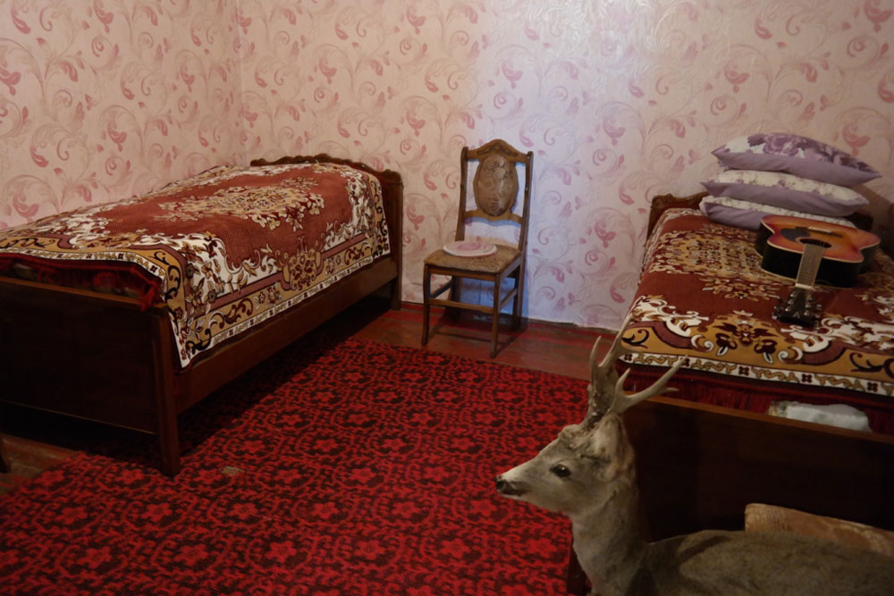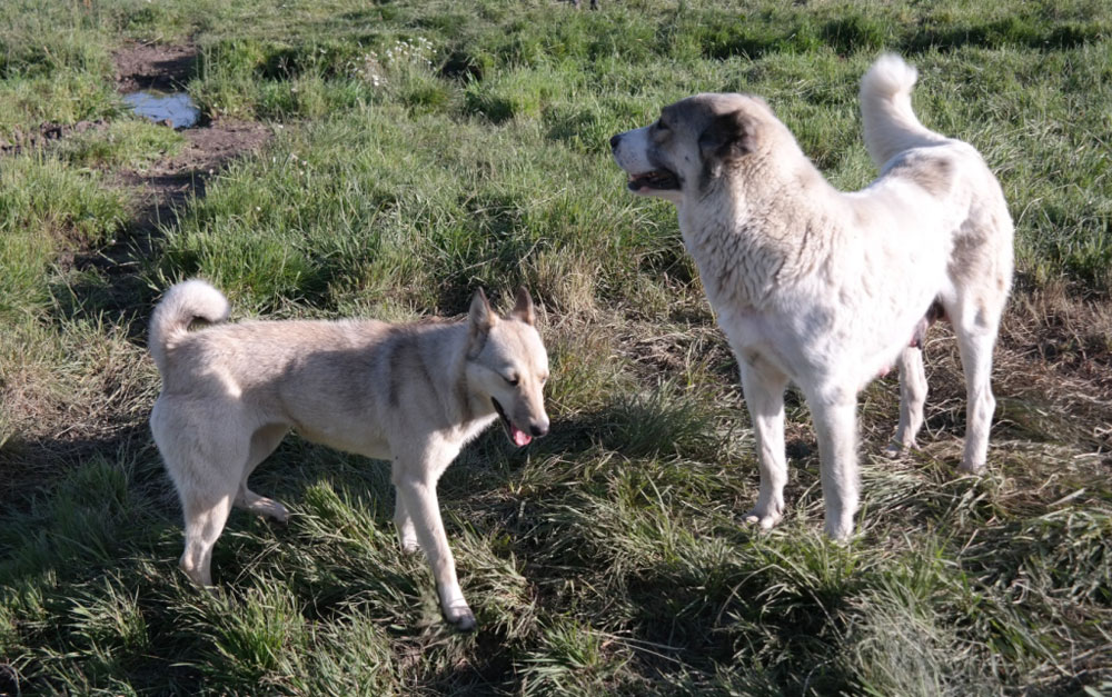 Ինքնաշարժէն իջնելուս պէս կը շրջապատուիմ ճերմակ մեծ գամփռերով: Սուսուփուս կը մեխուիմ տեղս` արտօնելով «տանտէրերուն» հոտուըտալով ծանօթութիւն հաստատել: Շաքրոն, ժպիտը դէմքին, հանգիստ կը դիտէ ընդունելութեան տեսարանը, ապա շուներուն կը հրահանգէ, որ ետ քաշուին: Տան բակ մեզի հետ միասին մուտք կը գործէ միայն լայքա ցեղատեսակին պատկանող շունը եւ հասնելով շեմին` կը պառկի այնտեղ: Տան մերձակայ մարգագետինէն կը լսուի սեւաթոյր ձիու խրխինջը: «Քուռակը մօտը չէ, անոր համար ալ անհանգիստ է», կը բացատրէ Շաքրոն: