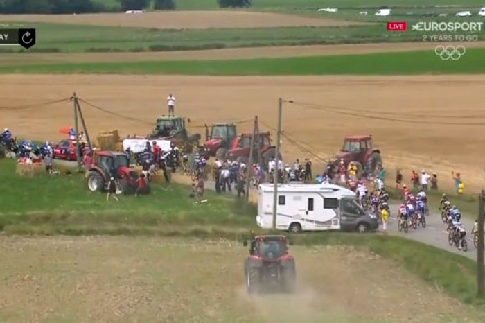 Ֆրանսայի հեծելարշաւի շրջավազքին, որ ծանօթ է «Թուր տը Ֆրանս» անունով, երէկուան 16-րդ հանգրուանը ընդհատուեցաւ, երբ ֆրանսացի հողագործներ բողոքի ցոյցեր կատարելով արգելք հանդիսացան անոր հեզասահ ընթացքին, յայտնեց «Եուրոսփոր»-ը: