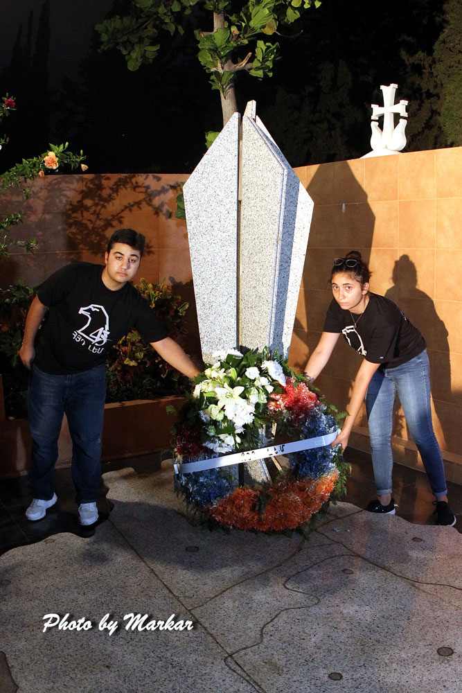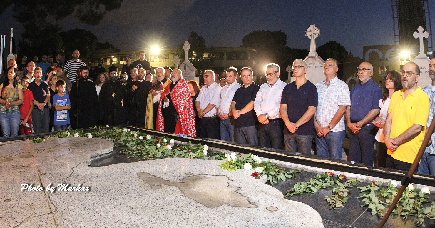 Հասնելով գերեզմանատուն, ներկաները մոմերով ու ծաղիկներով ուղղուեցան հինգ հերոսներուն դամբարանը, ուր տեղի ունեցաւ հոգեհանգստեան արարողութիւն: