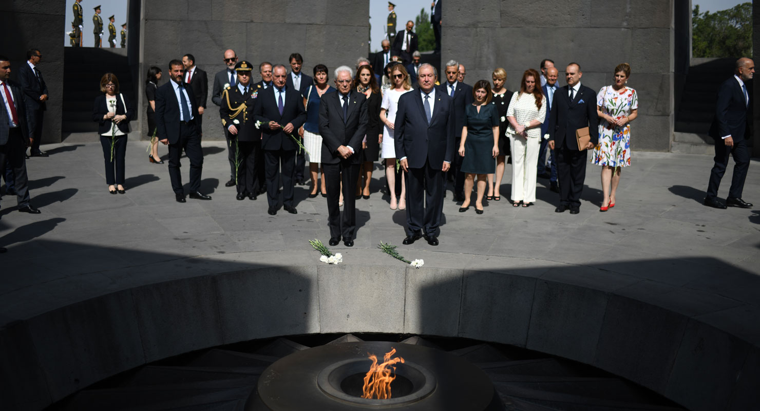 Ծիծեռնակաբերդ այցելութեան ընթացքին Հայաստանի եւ Իտալիոյ նախագահները ծաղկեպսակ զետեղած են յուշակոթողին առջեւ, ապա պատուիրակութեան անդամներուն հետ միասին ծաղիկներ դրած անմար կրակին մօտ եւ լռութեամբ յարգած սուրբ նահատակներուն յիշատակը: