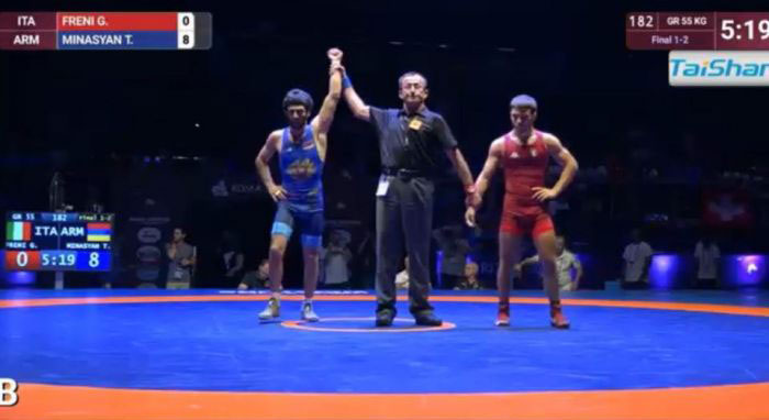 55 քկ ծանրութեան դասակարգի աւարտական մրցումին, հայ ըմբիշը 8-0 արդիւնքով յաղթեց իտալացի Ճիովանի Ֆրենիին եւ նուաճեց ոսկի մետալ: