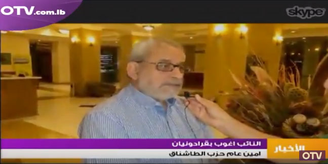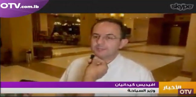 Երէկ երեկոյեան «Օ. Թի. Վի.»-ի արաբերէն լուրերուն ընթացքին ուղղակի կապ հաստատուեցաւ Երեւան գտնուող կայանի թղթակից Ապտօ Հելուի հետ, որ ՀՅԴ Լիբանանի Կեդրոնական կոմիտէն ներկայացնող պատուիրակութեան Հայաստան տուած այցելութեան նպատակին մասին ամփոփ զրոյց մը ունեցաւ ՀՅԴ Լիբանանի Կեդրոնական կոմիտէի ներկայացուցիչ, երեսփոխան Յակոբ Բագրատունիի եւ զբօսաշրջութեան նախարար Աւետիս Կիտանեանի հետ: