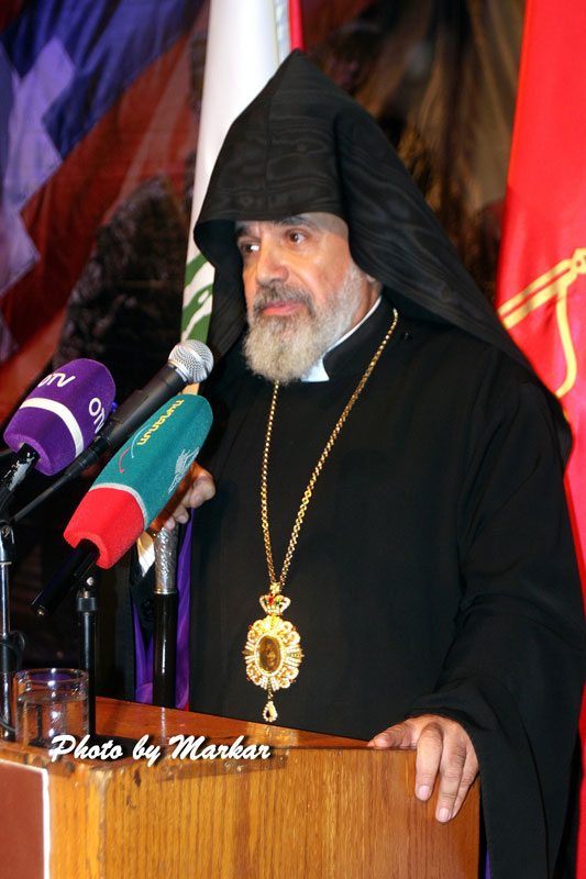 Աւարտին իր օրհնութեան խօսքը արտասանեց նորընտիր առաջնորդ Նարեկ արք. Ալեէմէզեան, որ բախտաւորութիւն ու արդար հպարտութիւն նկատեց իբրեւ Լիբանանի հայոց թեմի առաջնորդ եկեղեցւոյ մէջ տուած քարոզէն ետք իր առաջին պատգամը տալ Արցախի նուիրուած նման հանդիսութեան ընթացքին: Ան նշեց, որ երբ արցախեան շարժումը սկսաւ եւ Արցախ իր հանրապետութիւնը կերտեց, իւրաքանչիւր հայ, ո՛ւր ալ գտնուեցաւ, իր սրտի տրոփիւնին մէջ զգաց ու կը շարունակէ զգալ Արցախը: «Որովհետեւ մենք բոլորս մի զարկն ենք արցախեան պայքարին: Արցախի շարժում եւ Արցախի անկախութիւն… Արցախի Ազգային ժողովի փոխնախագահը շատ դիպուկ կերպով բնորոշեց, երբ ըսաւ` արիւն թափեցինք, այսօր քրտինք կը թափենք, եթէ պէտք ըլլայ դարձեալ արիւն կը թափենք: Սակայն քրտինք թափելը կեանքի ճանապարհ է մեզմէ իւրաքանչիւրին համար, որովհետեւ նահատակութիւնը` հայ քրիստոնէական հասկացողութեամբ, կ՛ըլլայ կեանքով եւ կը պսակուի արեամբ: Այսինքն` ամբողջական յանձնառութիւն է ան, մինչեւ մեր ամբողջական հայրենիքի ձեռքբերումը: Երբ կ՛ըսենք մենք մի զարկն ենք քո բազկի, անվերապահօրէն կը վերանորոգենք մեր ուխտը, թէ մենք զինուորներն ենք Արցախի բանակին, թէ՛ պատերազմի դաշտին վրայ, եւ թէ՛ կեանքի դաշտին վրայ», ըսաւ սրբազան հայրը: Ան դիտել տուաւ, որ հայութեան համար պատերազմը սկսաւ այն ատեն, երբ Հայկ նահապետ իր նետը արձակեց եւ զգետնեց Բէլը` հաստատելով, որ հայութիւնը պիտի շարունակէ իր նետերը արձակել մինչեւ բոլոր բէլերը զգետնուին, եւ ան կարենայ ամբողջական անկախութիւնը վայելել մեր ամբողջական հայրենիքին մէջ: Նարեկ արք. Ալեէմէզեան Աստուծմէ խնդրեց, որ Իր պահապան Աջը միշտ հովանի պահէ Արցախի, Հայաստանի եւ սփիւռքի բոլոր զաւակներուն վրայ, եւ մենք կարողանանք իբրեւ մէկ ժողովուրդ, մէկ պայքարի զինուորագրեալ բանակ շարունակել մեր յաղթական երթը: