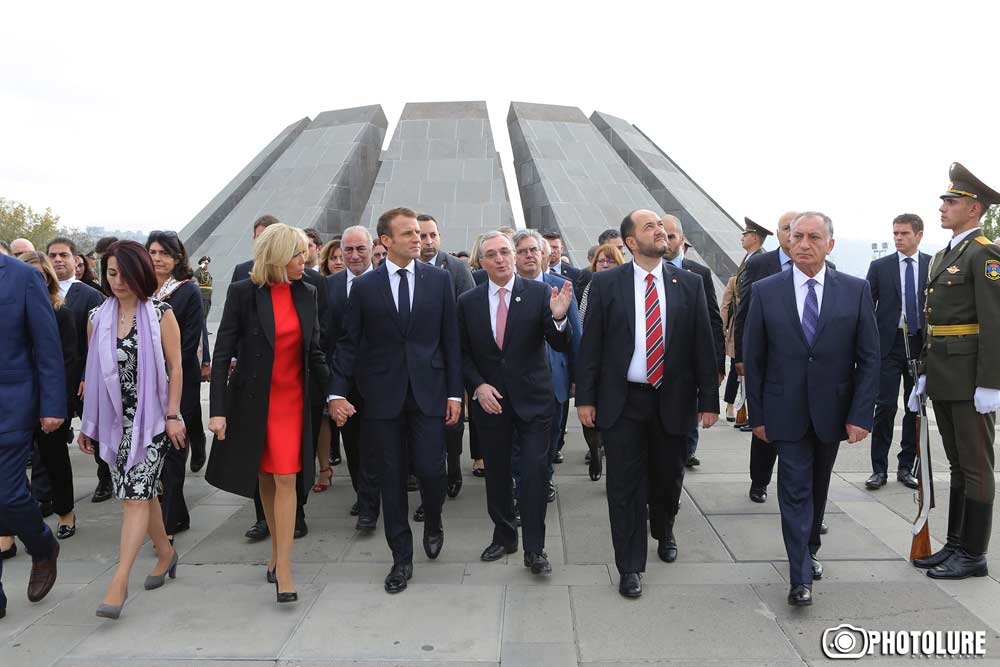 Ֆրանսայի նախագահ Էմմանուել Մաքրոն իր կնոջ հետ միասին այցելած է Ծիծեռնակաբերդի յուշահամալիր` յարգանքի տուրք մատուցելով Հայոց ցեղասպանութեան զոհերու յիշատակին: