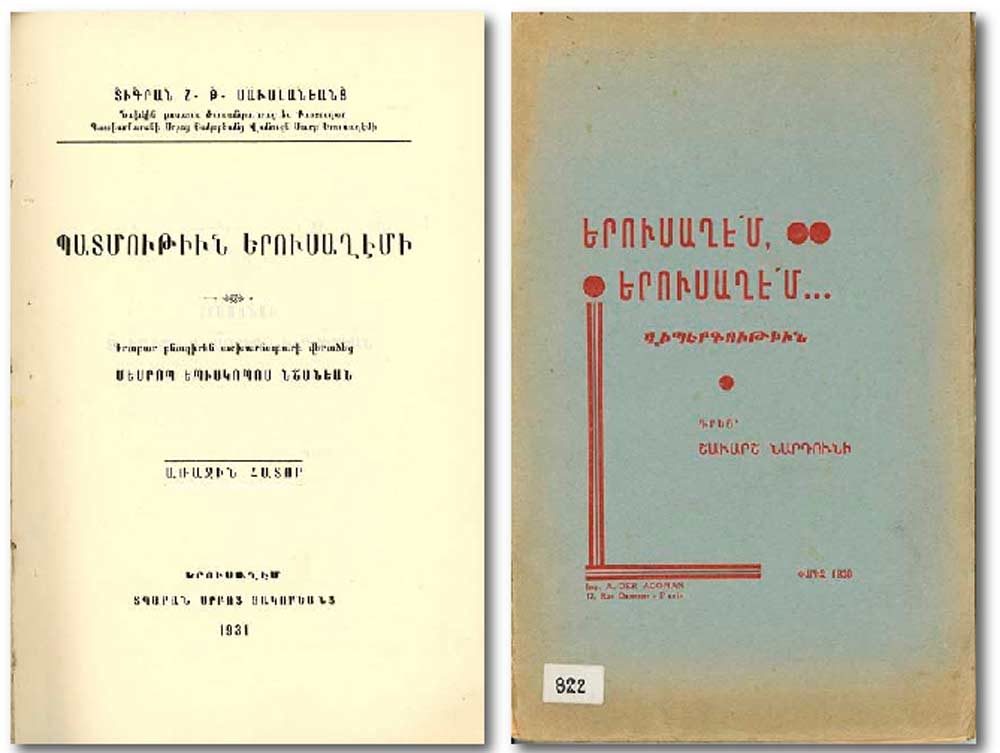 Նախ` այն քանի մը գիրքերը, որոնք կը խօսէին Երուսաղէմի մասին, եւ զորս կարդացեր էի տարիներ առաջ. Տիգրան Սաւալանեանցի «Պատմութիւն Երուսաղէմի» խորագրեալ երկհատոր գործը, որուն մէջ ամէնէն շատ տպաւորուեր էի Գրիգոր Շղթայակիր պատրիարքին պատմութեամբ, յետոյ` Մկրտիչ եպս. Աղաւնունիի «Միաբանք եւ այցելուք հայ Երուսաղէմի»-ն, Նարդունիին վիպերգութիւնը, Օրմանեան սրբազանին փոքր գիրքը, նոյնիսկ ԺԶ. դարու իտալացի բանաստեղծ Թասսոյին գլուխ-գործոց «Երուսաղէմ ազատեալ»-ը, զոր գեղեցկօրէն հայերէնի թարգմանած է հ. Արսէն Ղազիկեանը: