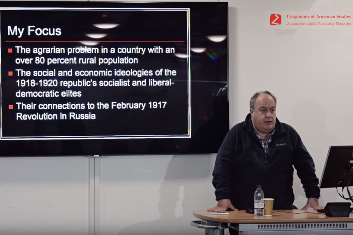 Այս դասախօսութեան ընթացքին տոքթ. Արա Սանճեանը նկարագրեց Անդրկովկասի մէջ հողային յարաբերութիւններու բարեկարգումի մասին քննարկումները` փետրուար 1917-էն մինչեւ մայիս 1918, ինչպէս եւ անոնց յաջորդած վէճերն ու Հայաստանի կառավարութեան գործունէութիւնը` մայիս 1918-էն մինչեւ 1920-ի աշունը: Տոքթ. Սանճեան` Միշիկընի համալսարան-Տիրպորնի պատմութեան դասախօս, անոր Հայկական հետազօտութիւններու կեդրոնի տնօրէնն է: Այս դասախօսութիւնը տեղի ունեցաւ Լոնտոնի մէջ, երկուշաբթի, 21 մայիս 2018-ին, կազմակերպութեամբ Հայագիտական ուսմանց ծրագիրի տնօրէն տոքթ. Գրիգոր Մոսկոֆեանին կողմէ եւ ատենավարութեամբ Ռաֆայէլ Կրեկորեանի:
