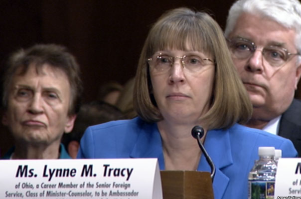Միացեալ Նահանգներու դեսպանները կ՛առաջադրուին նախագահին կողմէ, սակայն կը հաստատուին Ծերակոյտին կողմէ: Պետական ոլորտին մէջ 24 տարուան աշխատանքի փորձառութիւն ունեցող Լին Թրէյսին Միացեալ Նահանգներու արտաքին գործոց նախարարութեան Ռուսիոյ հարցերով աւագ խորհրդականն էր: Ան նախապէս վարած է Ռուսիոյ եւ Թուրքմենիստանի մէջ Միացեալ Նահանգներու փոխդեսպանի պաշտօնը, եղած է Միացեալ Նահանգներու արտաքին գործոց փոխնախարարի տեղակալ` Հարաւային եւ Կեդրոնական Ասիոյ երկիրներուն հարցով: