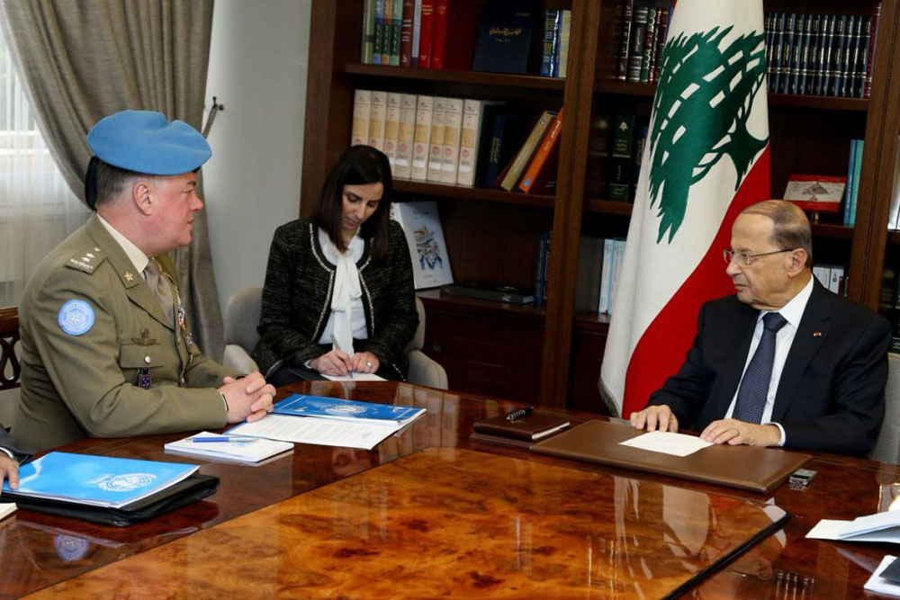 Հանրապետութեան նախագահ զօր. Միշել Աուն երէկ առաւօտեան նախագահական պալատին մէջ ընդունեց Հարաւային Լիբանանի մէջ տեղակայուած ՖԻՆԻՒԼ-ի միջազգային խաղաղապահ ուժերու հրամանատար զօր. Սթեֆանօ Տել Քոլը, որուն յայտնեց, թէ Լիբանան կառչած կը մնայ ՄԱԿ-ի Ապահովութեան խորհուրդի թիւ 1701 բանաձեւի գործադրութեան` մեկնելով հարաւային Լիբանանի ապահովական կայունութիւնը պաշտպանելու եւ սահմանային անդորրութեան խախտումը կանխարգիլելու իր յանձնառութենէն: