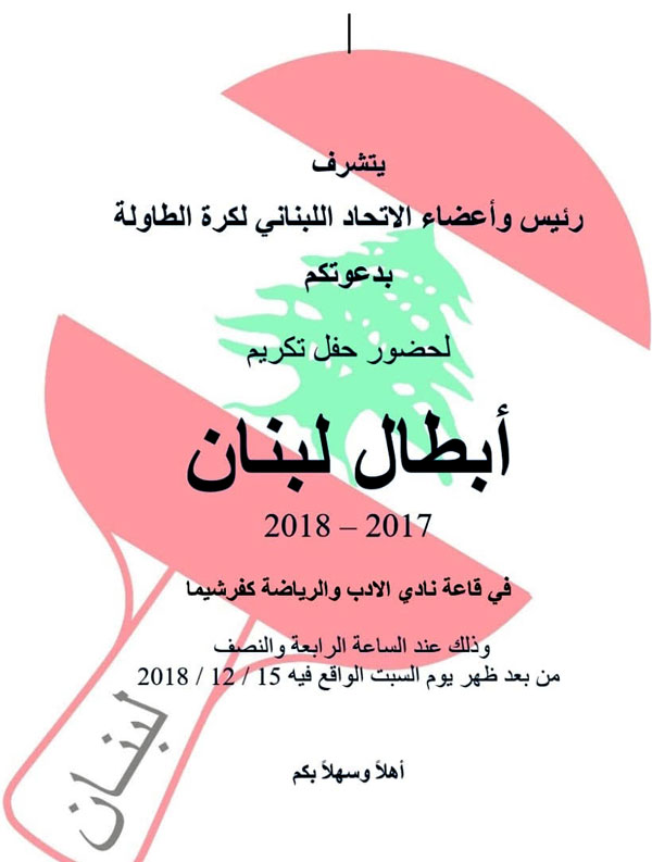 Շաբաթ, 15 դեկտեմբերին, Լիբանանի փինկ փոնկի ֆետերասիոնը կը կատարէ 2018 տարեշրջանի մրցանակաբաշխութիւնը բոլոր անոնց, որոնք Լիբանանի ախոյեանութեան եւ տարբեր տեսակի մրցաշարքերու ընթացքին մրցանակային դիրքերու արժանացան: