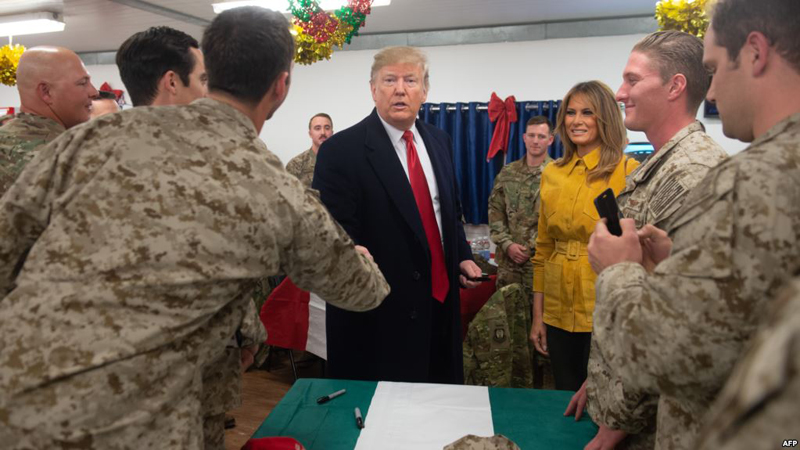 Նախագահը իր կնոջ` Մելանիա Թրամփի հետ չորեքշաբթի գիշեր անակնկալ այցելութիւն տուած էր Իրաքի մայրաքաղաք Պաղտատէն արեւմուտք տեղակայուած Այն Ասատ ռազմակայանին եւ շուրջ 20 վայրկեան զրուցած ամերիկացի զինուորներու հետ: Նշենք, որ Իրաքի մէջ շուրջ 5000 ամերիկացի զինուոր կայ: