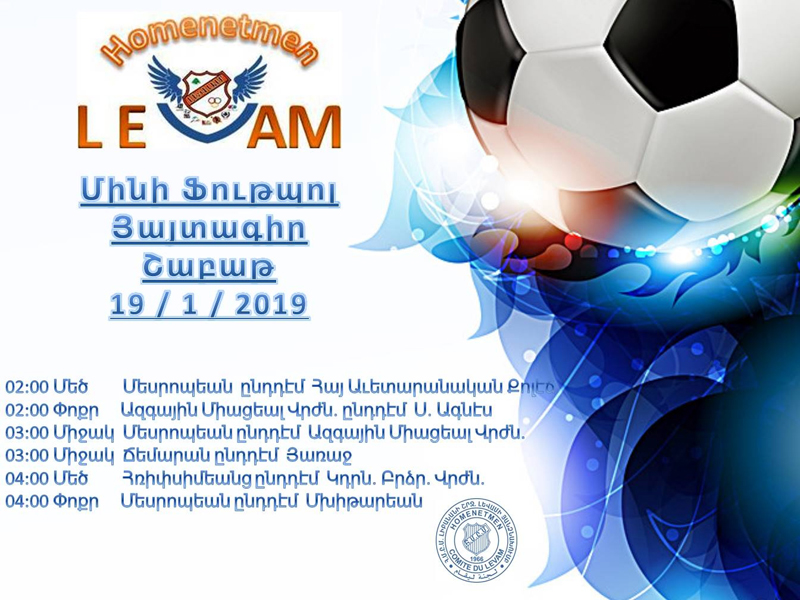 ՀՄԸՄ-ի Լիբանանի Շրջանային վարչութեան ԼԵՎԱՄ-ի յանձնախումբին կազմակերպած մինի ֆութպոլի առաջին հանգրուանի մրցումները պիտի սկսին այս շաբաթ, 19 յունուար 2019-ին,Պուրճ Համուտի «Հայր Պօղոս Արիս» մարզադաշտին վրայ` հետեւեալ յայտագիրին հիմամբ.