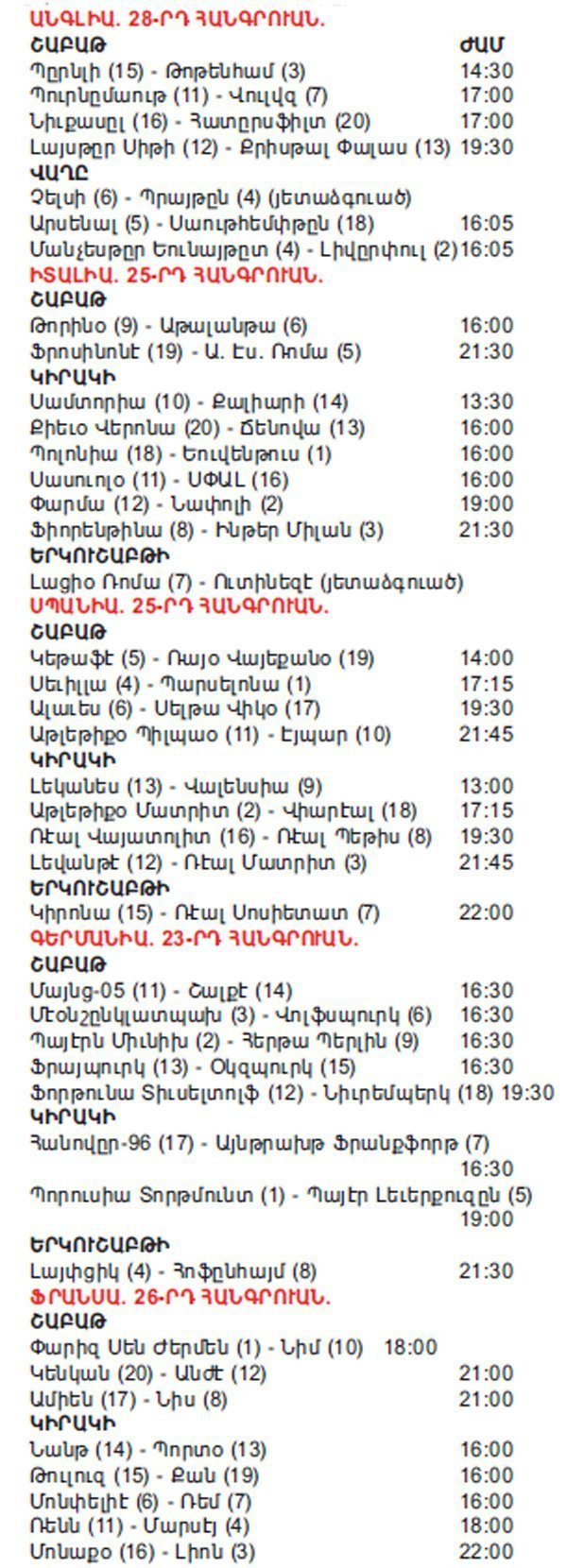 Ստորեւ` շաբաթավերջի մրցումներուն յայտագիրը (ժամերը` Պէյրութի ժամանակացոյցով. փակագիծերուն մէջ` խումբերուն գրաւած դիրքերը).