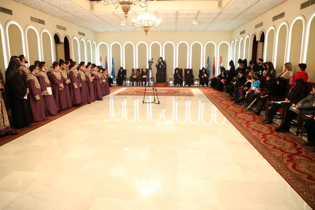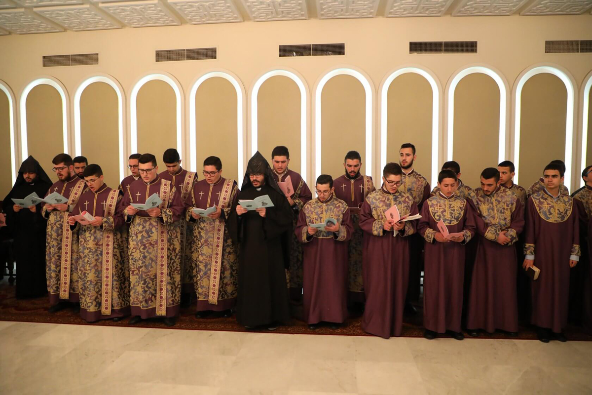 Պատարագէն ետք, հայրապետական թափօրը ուղղուեցաւ վեհարանի դահլիճ, ուր ներկայ բազմութեան մասնակցութեամբ հնչեցին Վարդանանց երգեր ու շարականներ: